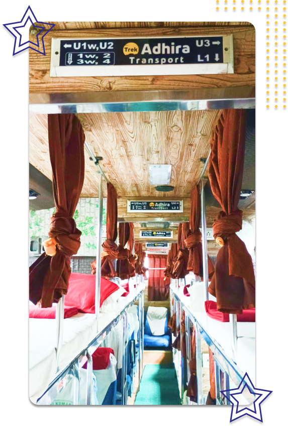 Adhira Transport We provides bus services between various locations across TamilNadu. Being an expert on the other transportation sectors, we are able to provide excellent bus service. Take a ride on our Semi Sleeper bus and feel the awesomeness. We are working to extend our services to various other destinations in near future.